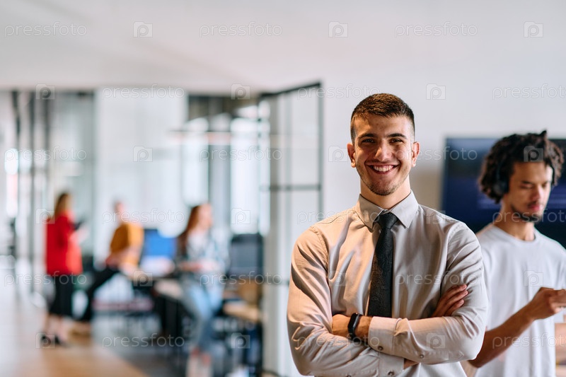 Молодой руководитель бизнеса стоит со скрещенными руками в коридоре современного офиса, излучая уверенность и целеустремленность, олицетворяя динамичное и вдохновляющее присутствие