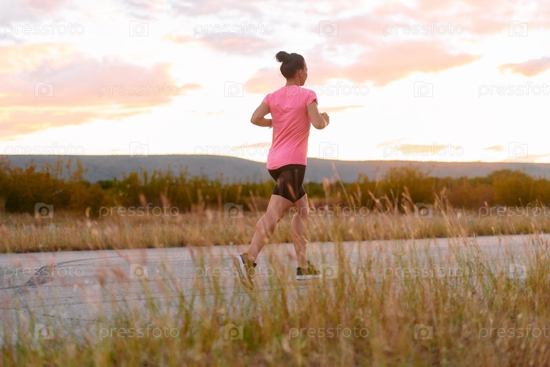 Решительный спортсмен бежит под солнцем на фоне прекрасной природы