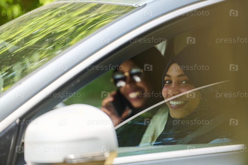 Две мусульманки в хиджабах разговаривают по смартфону, путешествуя вместе в машине по