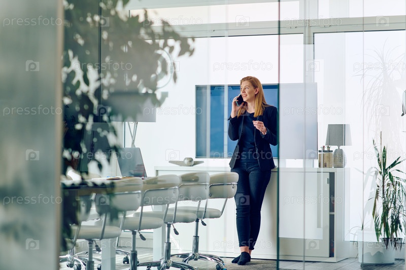 Бизнес-леди разговаривает по смартфону в современной офисной обстановке