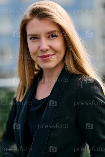 Портрет стильной деловой блондинки, позирующей на террасе в городском пейзаже