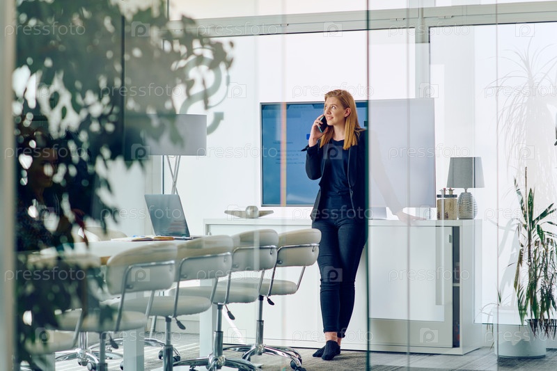 Бизнес-леди разговаривает по смартфону в современной офисной обстановке
