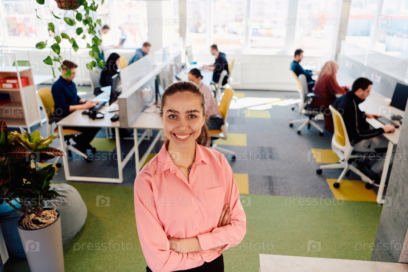 Портрет молодой улыбающейся деловой женщины в креативном открытом пространстве коворкинга стартап-офиса. Успешная бизнес-леди стоит в офисе с копирайтом. Коллеги, работающие на заднем плане