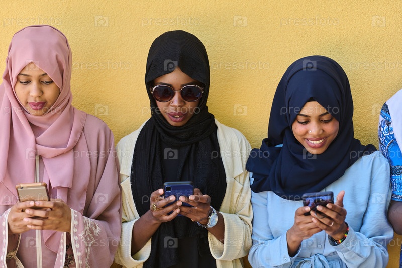 Группа подростков стоит вместе у стены, используя смартфоны