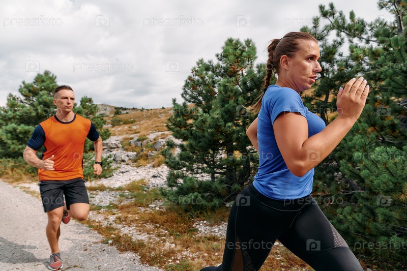 Пара в спортивной одежде бежит по живописной дороге во время утренней тренировки, наслаждаясь свежим воздухом и поддерживая здоровый образ жизни