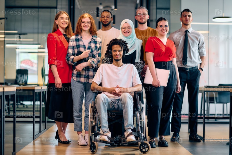 Группа молодых бизнесменов разного пола идет по коридору в застекленном офисе современного стартапа, среди них — человек в инвалидной коляске и женщина в хиджабе
