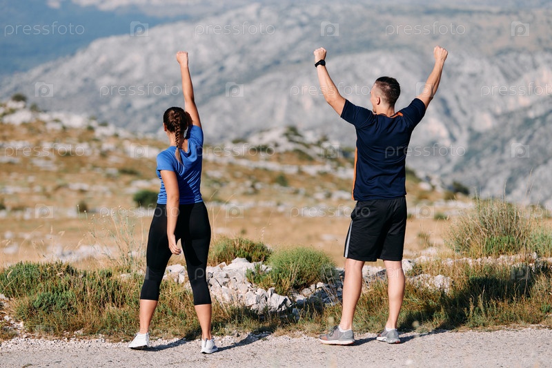 Радостная пара празднует успешное завершение утренней пробежки