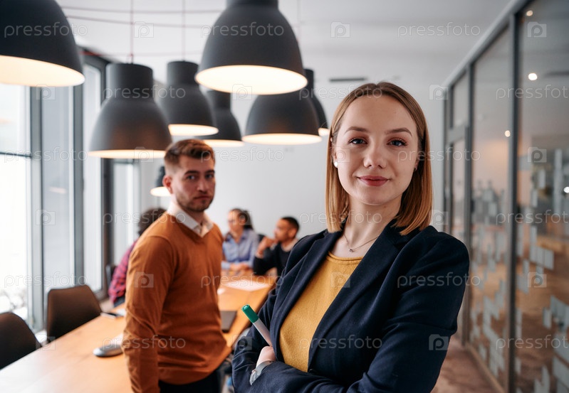 Уверенная в себе светловолосая бизнес-леди руководит командой в современной офисной обстановке