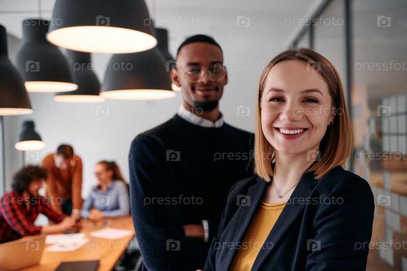 Динамичный лидерский дуэт: светловолосый директор и молодой афроамериканский предприниматель в офисной обстановке