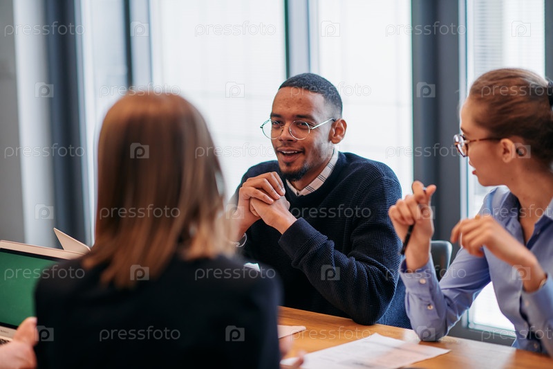 В яркой атмосфере современного офиса стартапа разнообразная команда профессионалов в сфере бизнеса участвует в обсуждениях различных проектов и разрабатывает новые бизнес-стратегии, олицетворяя креативность и инновации в предпринимательской среде