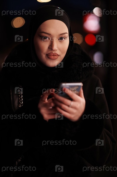 Европейская мусульманка в хиджабе, бизнес-леди, проверяет свой телефон на городской улице ночью