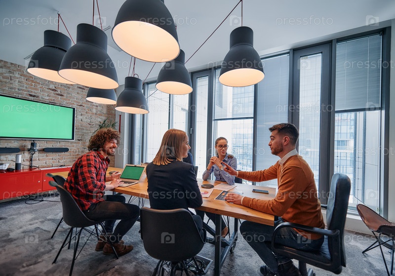 В яркой атмосфере современного офиса стартапа разнообразная команда профессионалов в сфере бизнеса участвует в обсуждениях различных проектов и разрабатывает новые бизнес-стратегии, олицетворяя креативность и инновации в предпринимательской среде