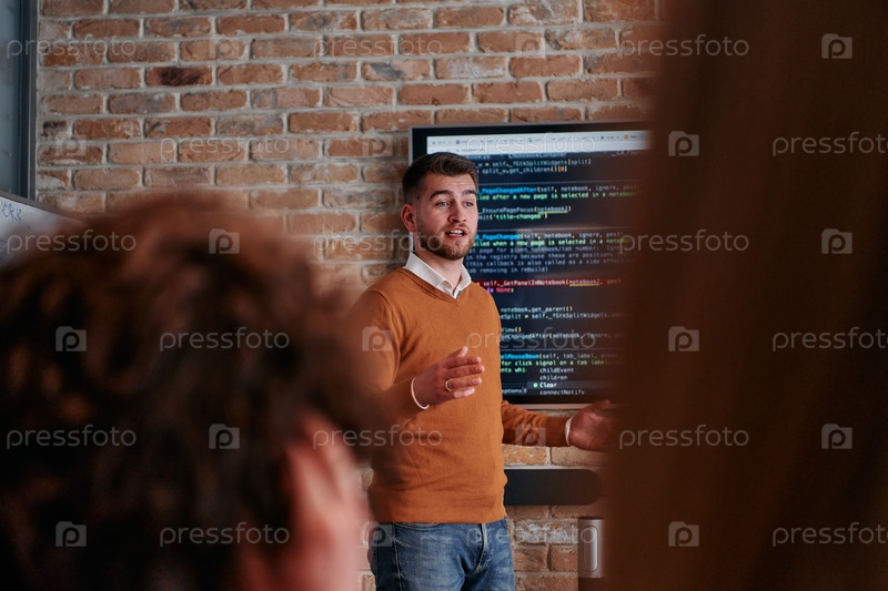 В корпоративной обстановке бизнесмен проводит совещание, страстно представляя бизнес-план своей внимательной команде, способствуя сотрудничеству и стратегическому мышлению