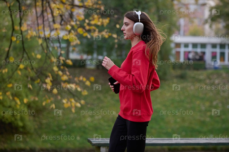 Молодая красивая женщина бежит в осеннем парке и слушает музыку в наушниках на смартфоне