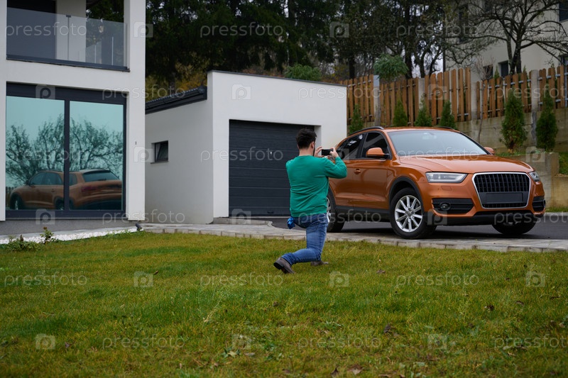 Мужчина тщательно моет и чистит свою машину на подъездной дорожке к дому, демонстрируя гордость за свое транспортное средство и прилегающую территорию