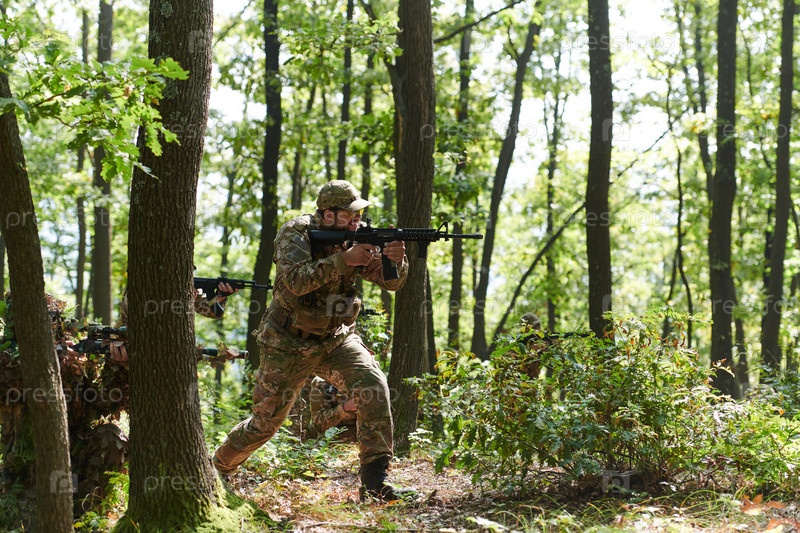 Специализированное военное антитеррористическое подразделение проводит секретную операцию в густом, опасном лесу, демонстрируя точность, дисциплину и стратегическую готовность