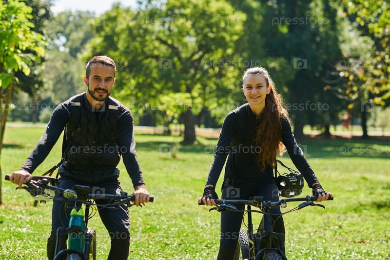 Счастливая пара, одетая в профессиональную велосипедную экипировку, наслаждается романтической велопрогулкой по парку, окруженному современными природными достопримечательностями, излучая любовь и счастье
