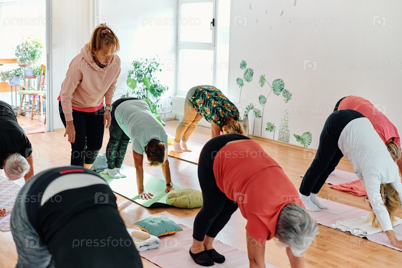 Группа пожилых женщин занимается различными упражнениями йоги, включая растяжку шеи, спины и ног, под руководством тренера в залитом солнцем месте, способствуя благополучию и гармонии