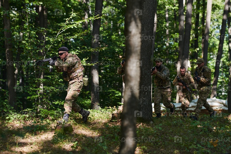 Специализированное военное антитеррористическое подразделение проводит секретную операцию в густом, опасном лесу, демонстрируя точность, дисциплину и стратегическую готовность