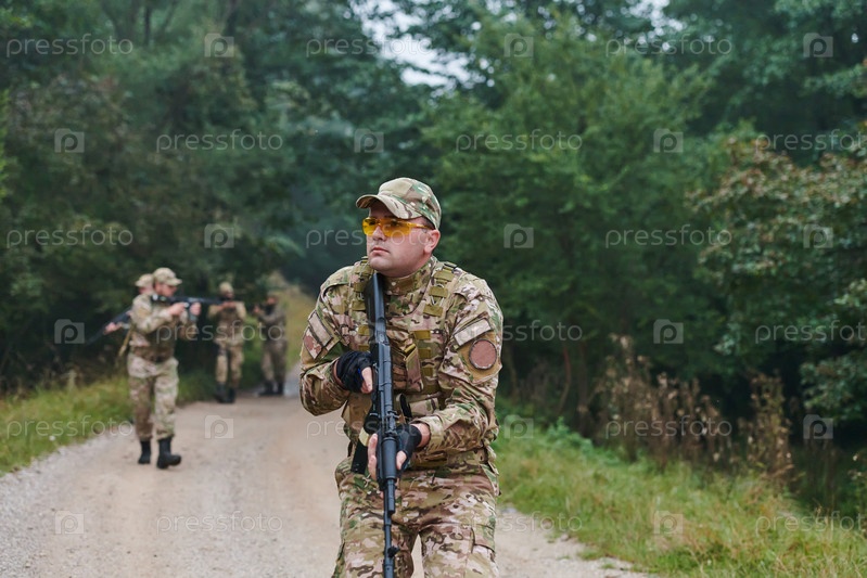 Дисциплинированное и специализированное военное подразделение, облаченное в камуфляж, осуществляющее стратегическое патрулирование и сохраняющее контроль в обстановке с высокими ставками, демонстрирующее свою точность, сплоченность и готовность к специаль