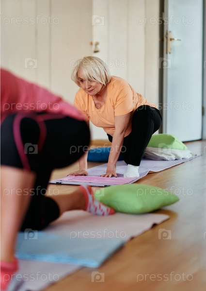 Женщины старшего возраста занимаются оздоровлением: йогой и растяжкой в залитом солнцем пространстве