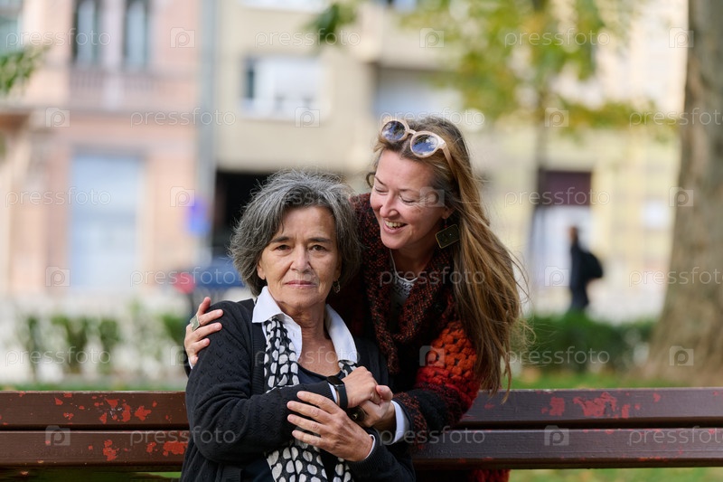 Обнимая поколения: любовь и поддержка дочери для ее пожилой матери в солнечный день в парке