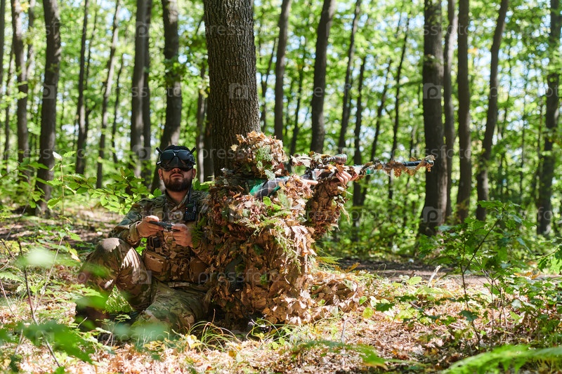 Опытный снайпер и солдат, управляющий дроном с очками виртуальной реальности, разрабатывают стратегию и наблюдают за военными действиями, скрываясь в лесу