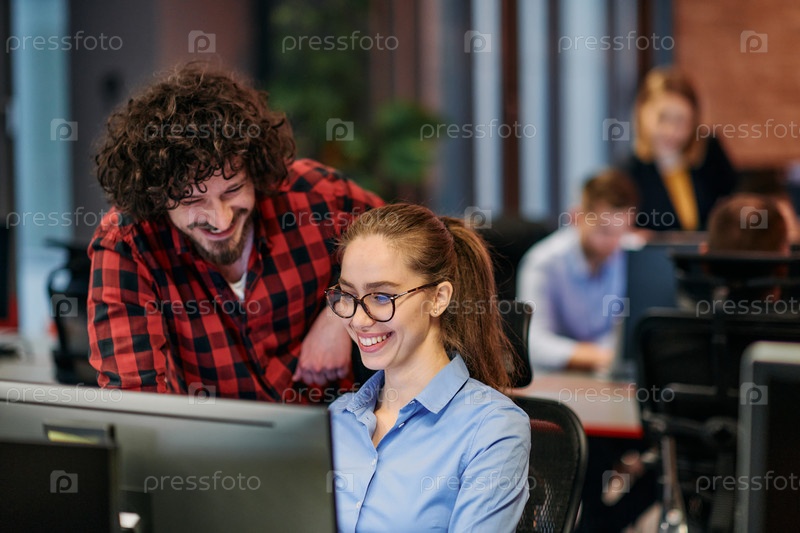 Коллеги по бизнесу, мужчина и женщина, обсуждают бизнес-стратегии, внимательно глядя на монитор компьютера, олицетворяя сотрудничество и инновации