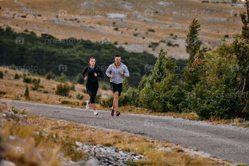 Пара в спортивной одежде бежит по живописной дороге во время утренней тренировки, наслаждаясь свежим воздухом и поддерживая здоровый образ жизни