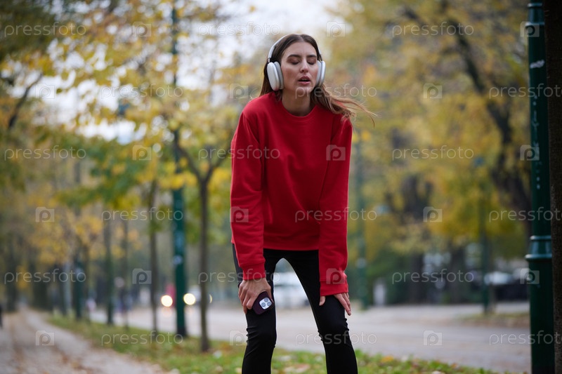 Спортивная молодая женщина делает вдох и расслабляется после пробежки и растяжки. Тренировка женщины и упражнения для тренировки на улице