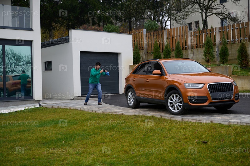 Мужчина тщательно моет и чистит свою машину на подъездной дорожке к дому, демонстрируя гордость за свое транспортное средство и прилегающую территорию