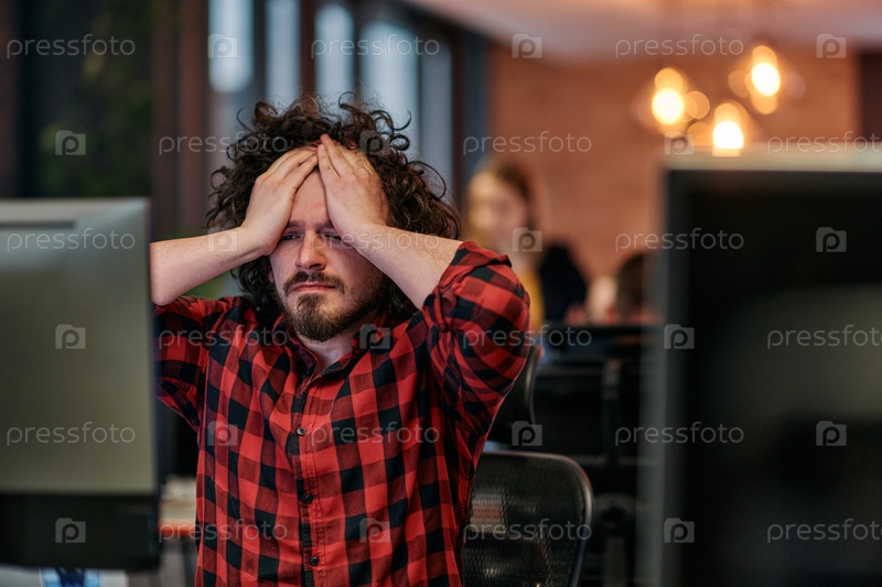 Разочарованный программист с растрепанными волосами смотрит на монитор компьютера в офисе