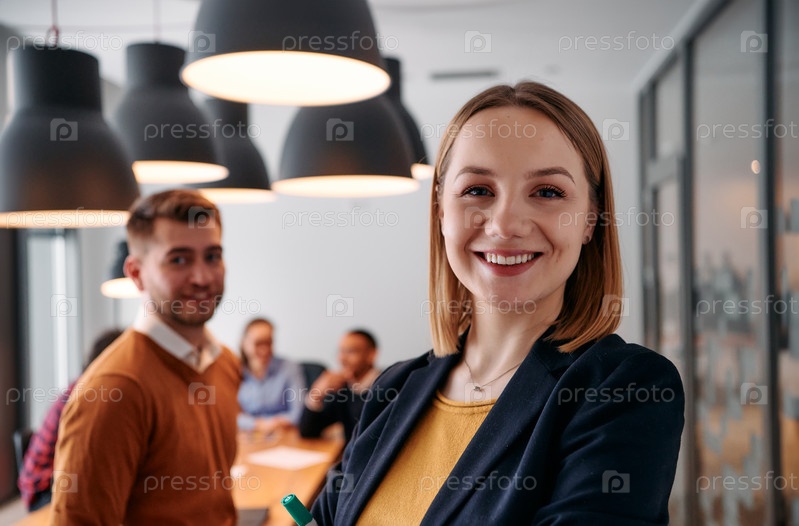 Уверенная в себе светловолосая бизнес-леди руководит командой в современной офисной обстановке