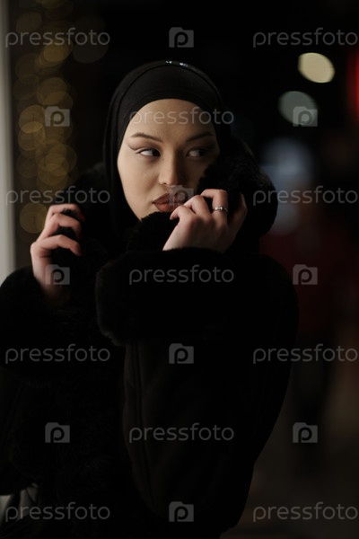 Мусульманка идет по городской улице холодной зимней ночью в хиджабе