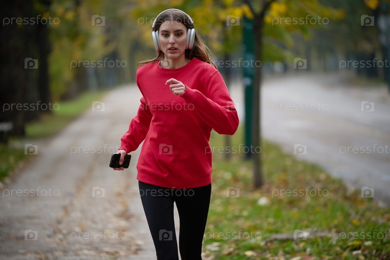 Молодая красивая женщина бежит в осеннем парке и слушает музыку в наушниках на смартфоне