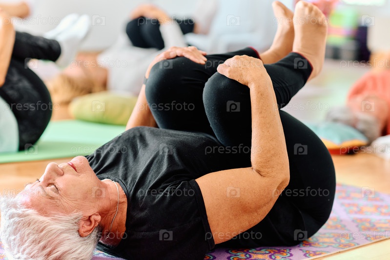 Группа пожилых женщин занимается различными упражнениями йоги, включая растяжку шеи, спины и ног, под руководством тренера в залитом солнцем месте, способствуя благополучию и гармонии