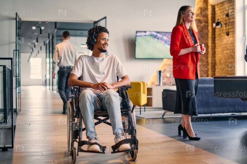Молодой афроамериканский предприниматель в инвалидной коляске окружен своими коллегами по бизнесу в современном офисе, олицетворяя разнообразие и сотрудничество на рабочем месте