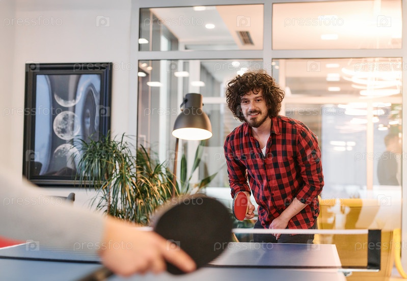 Коллеги по бизнесу отдыхают от работы, чтобы поиграть в настольный теннис, способствуя командной работе и товариществу на рабочем месте