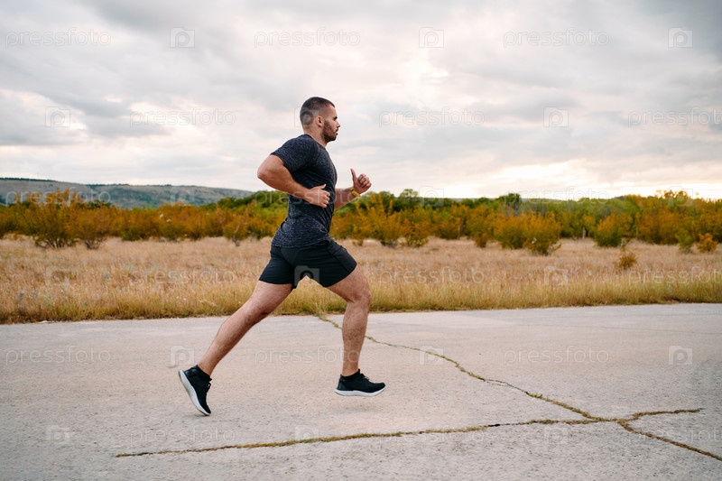 Спортивный мужчина бегает трусцой на солнце, готовя свое тело к экстремальным испытаниям жизни