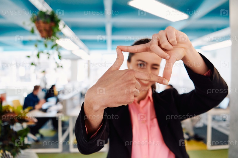 Крупный план рук, улыбающаяся деловая женщина, делающая жест кадра в современном ярком коворкинге открытого пространства стартап-офиса