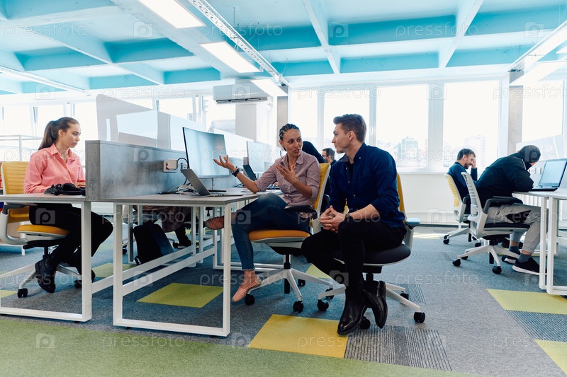 Совместный процесс многонациональной квалифицированной молодой бизнес-команды во время мозгового штурма в офисе. Разнообразная группа молодых людей, одетых в официальную одежду, сотрудничает в разработке дизайн-проекта