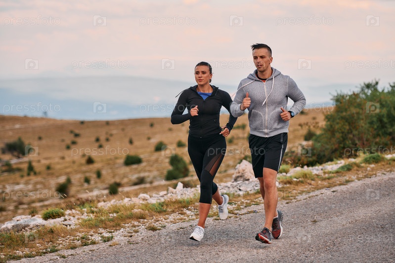 Пара в спортивной одежде бежит по живописной дороге во время утренней тренировки, наслаждаясь свежим воздухом и поддерживая здоровый образ жизни