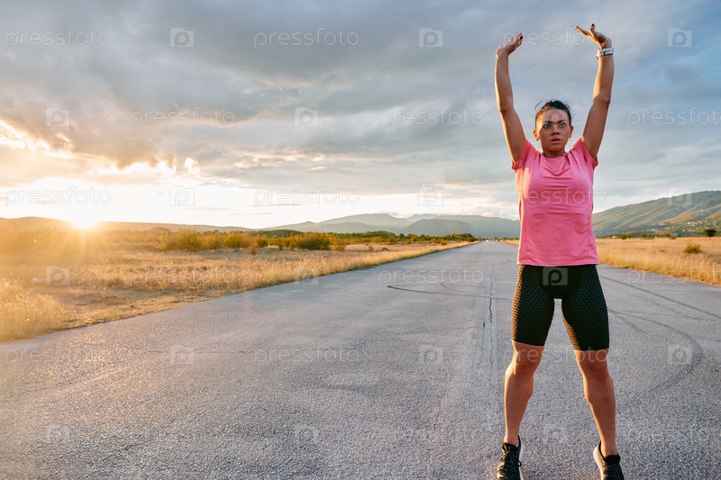 Спортсмен растягивается на закате после интенсивной пробежки