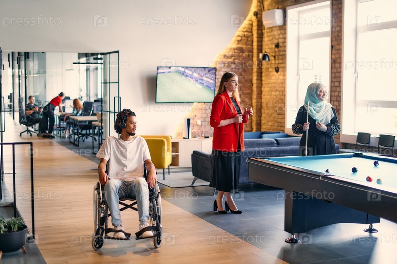 Молодой афроамериканский предприниматель в инвалидной коляске окружен своими коллегами по бизнесу в современном офисе, олицетворяя разнообразие и сотрудничество на рабочем месте