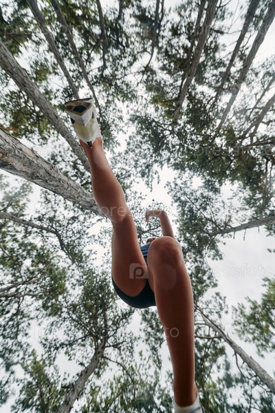 Авантюрная женщина преодолевает лесные препятствия с решимостью и ловкостью