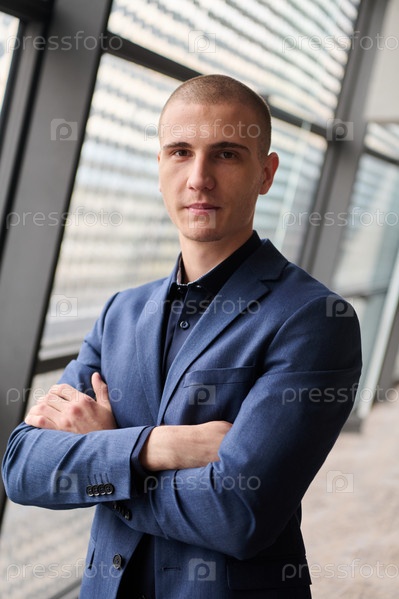 Портрет молодого бизнесмена со скрещенными руками на его фабрике