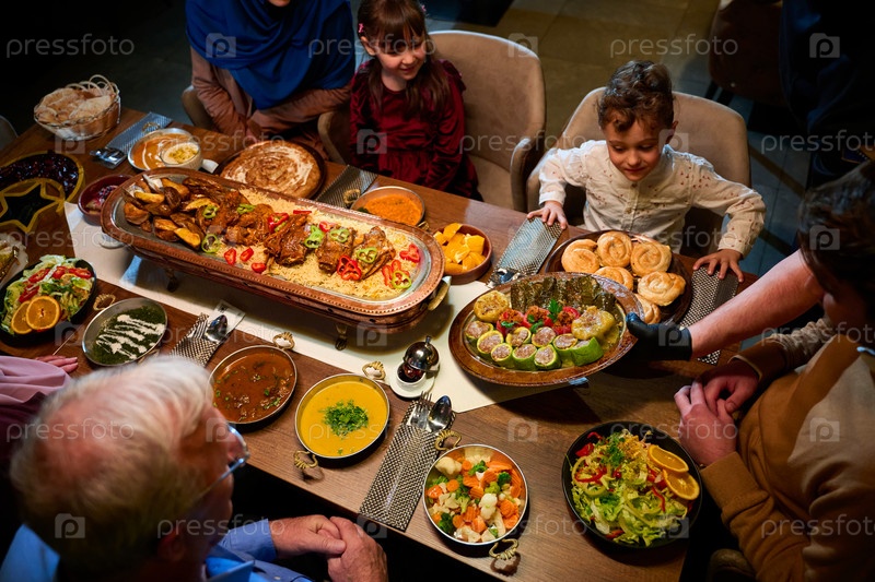 На этом захватывающем виде сверху вкусная еда, украшенная в стиле Рамадана, включая финики и мясо, ожидает прибытия европейской исламской семьи, обещающей праздничное и ароматное празднование ифтара