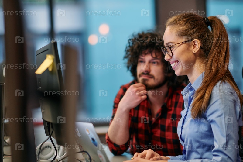 Коллеги по бизнесу, мужчина и женщина, обсуждают бизнес-стратегии, внимательно глядя на монитор компьютера, олицетворяя сотрудничество и инновации