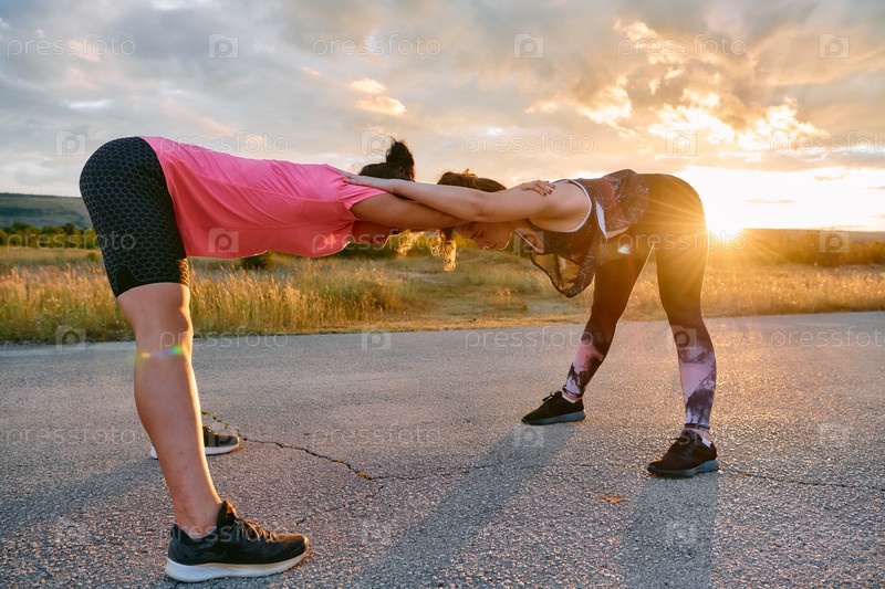 Две спортсменки занимаются растяжкой на закате в окружении прекрасной природы