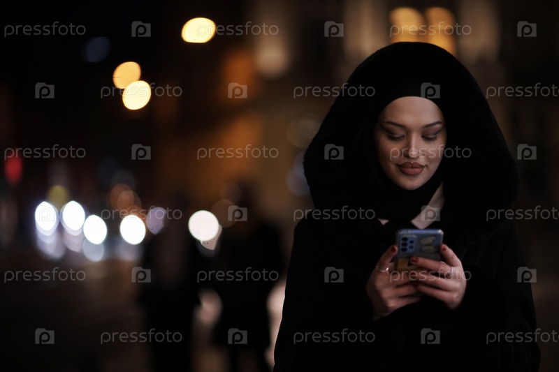 Мусульманка идет по городской улице холодной зимней ночью в хиджабе